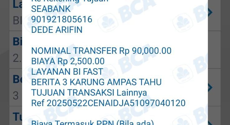 Dina operasina, Dede Arifin nyodorkeun dua nomor rekening nu aya di dua bank, nyatea Sea Bank norek 9019-2180-5616 jeung Dana Bank norek 0812-881-881-25. “Simkuring transferna ka nomer Sea Bank. Tos opat dinten ti Rebo dugi ka dinten Sabtu ayeuna (24/5/2025), weleh barang tilu karung hampas tahu nu dipesen teh teu dongkap ka rorompok,” cek Ara.