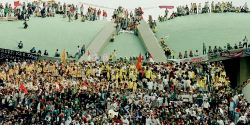 Rebuan mahasiswa ngepung jeung "menguasai" Gedung DPR MPR RI Jakarta Mei 1998. Orde Baru tijurahroh, Orde Reformasi mecenghul. (Foto: SundaNews/RRI.co.id)